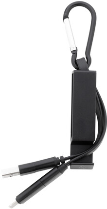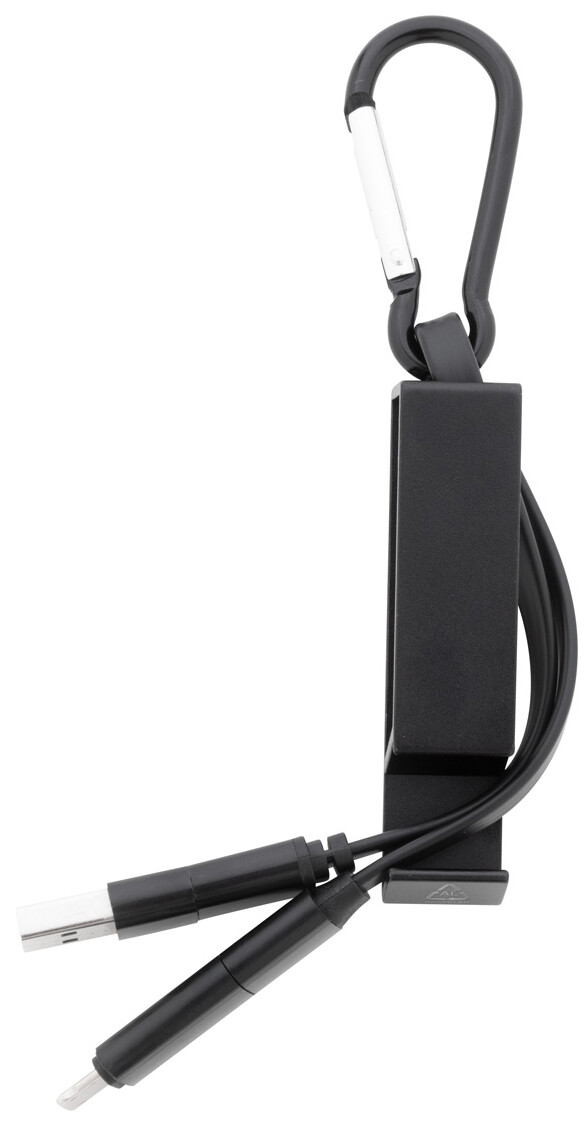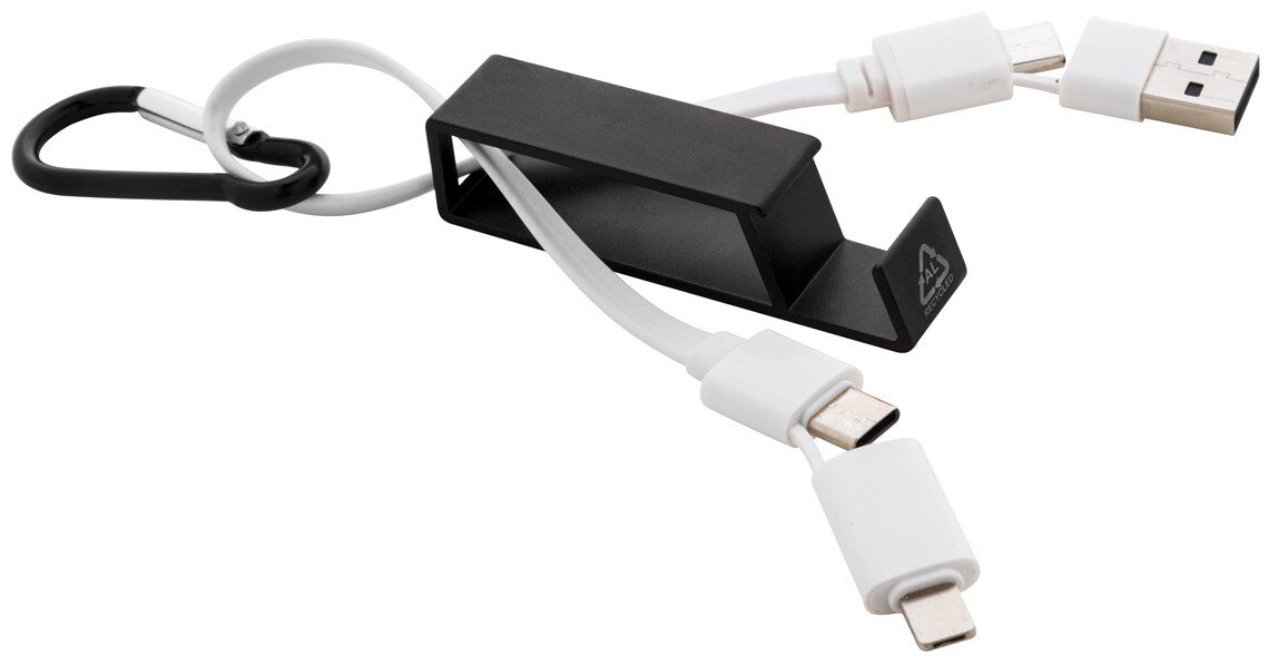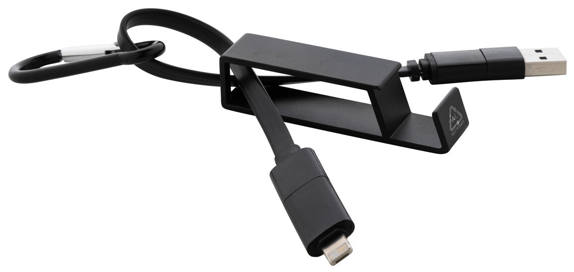 USB nabíjecí kabel s karabinou z recyklovaného hliníku a držákem na mobil s funkcí otvíráku lahví. S konektory micro USB, USB-C a Lightning. Se vstupy USB a USB-C.