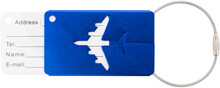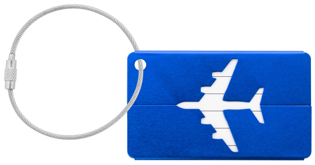 Hliníková visačka na zavazadla s motivem letadla a kovovým lankem.