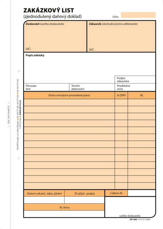 Zakázkový list je samopropisovací a nečíslovaný. Má formát A5 orientovaný na výšku.