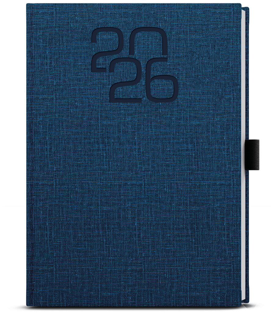 Týdenní diář modré barvy formátu A5 vyrobený ze zajímavého materiálu s moderní ražbou roku a poutkem na tužku.