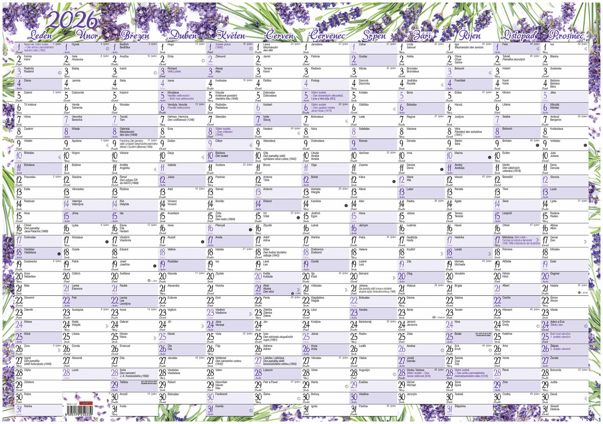 Nástěnný roční kalendář s motivem Levandule v praktické velikosti 60 cm. Pověste si ho na lednici nebo na skříň a prostě plánujte.