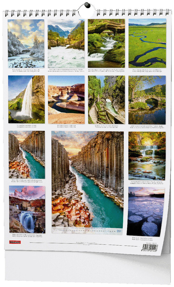 Nástěnný kalendář s obrázky působivých řek a přírodních scenérií.