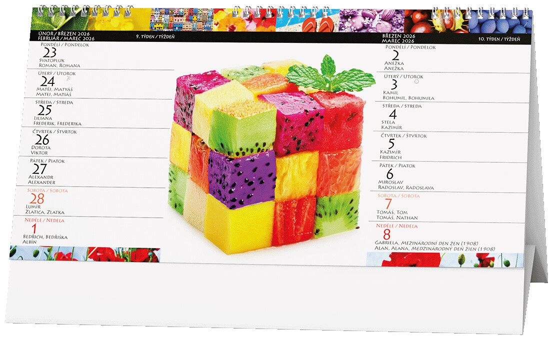 Stolní kalendář se čtrnáctidenním kalendáriem a pestrobarevnými motivy.