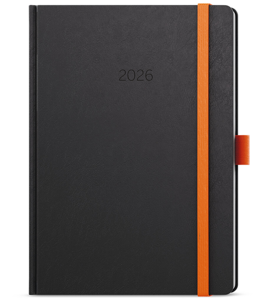 Neobyčejný denní diář s matným povrchem ze strukturovaného materiálu s oranžovou gumičkou a poutkem. Je vyráběný ve formátu A5, má velký prostor pro poznámky a plánování.