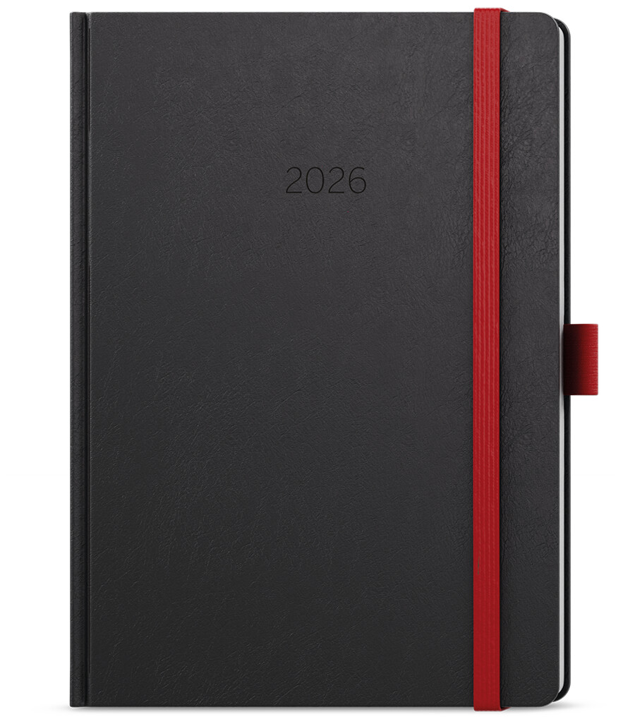 Neobyčejný týdenní diář s matným povrchem ze strukturovaného materiálu s červenou gumičkou a poutkem. Je vyráběný ve formátu A5, má velký prostor pro poznámky a plánování.
