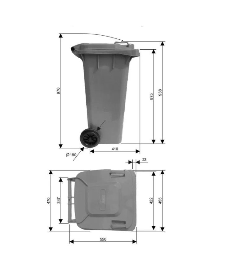 Nádoba na odpadky je vyrobená je z mrazuvzdorného a pevného polyetylenu technologií vstřiku, je velmi odolná proti vodě i UV záření. Opatřená je víkem pro uzavření a dvěma koly usnadňujícími manipulaci.