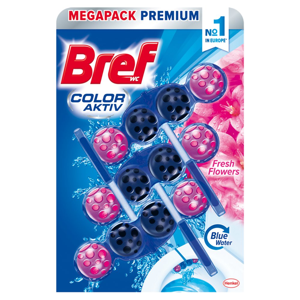 Bref WC blok Color Aktiv – Květinová vůně zajišťuje hygienickou čistotu a svěžest vaší toalety při každém spláchnutí. Díky aktivním látkám v modré vodě a příjemné květinové vůni zanechá toaletu dokonale čistou a voňavou.