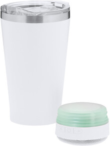 Termohrnek s dvojitou stěnou a izolací z nerezové oceli, víčkem na pití a bezdrátovým reproduktorem s vícebarevnými LED světly, funkcí hands-free volání a vestavěnou dobíjecí baterií. Objem 440 ml.