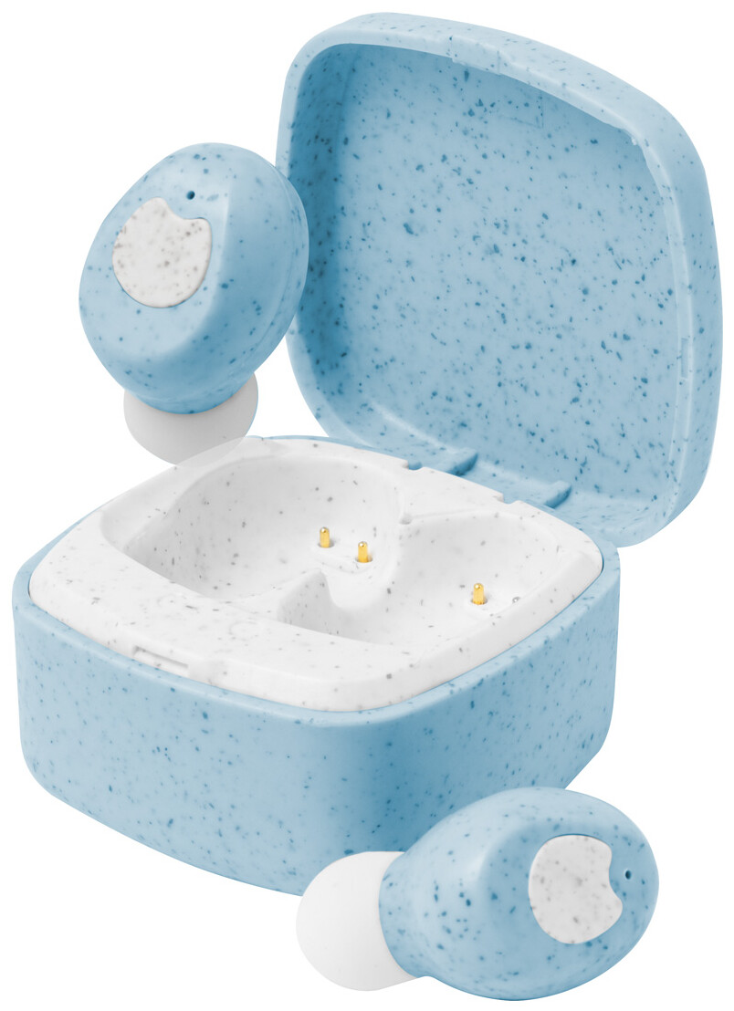 Ekologická plastová sluchátka s pšeničnou slámou, skutečně bezdrátová stereofonní sluchátka (TWS) s funkcí handsfree volání v nabíjecím pouzdře. Včetně nabíjecího kabelu USB.
