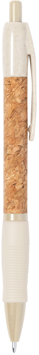 Ekologické plastové kuličkové pero z pšeničné slámy s pouzdrem potaženým přírodním korkem a pryžovým úchopem. S modrou náplní.