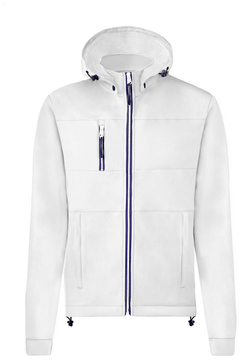 Větru a voděodolná softshellová bunda na zip se 2 bočními kapsami, 1 přední kapsou, stojáčkem a odepínací kapucí. 100% polyester, 300 g/m2.
