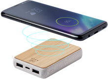USB powerbanka s baterií 5 000 mAh z bambusu a plastu z pšeničné slámy s vestavěnou bezdrátovou nabíječkou. Se 2 USB nabíjecími porty. Powerbanku lze nabíjet přes port USB-C. Včetně USB nabíjecího kabelu.