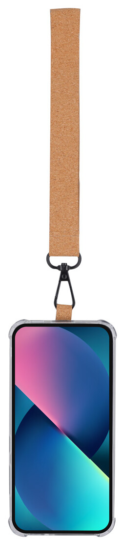Pásek s držákem na na mobil z přírodního korku s vložkou na telefon a kovovou karabinou.