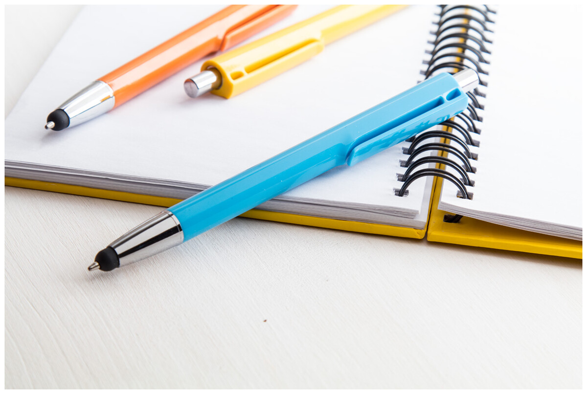 Plastové kuličkové a dotykové pero s modrou náplní.