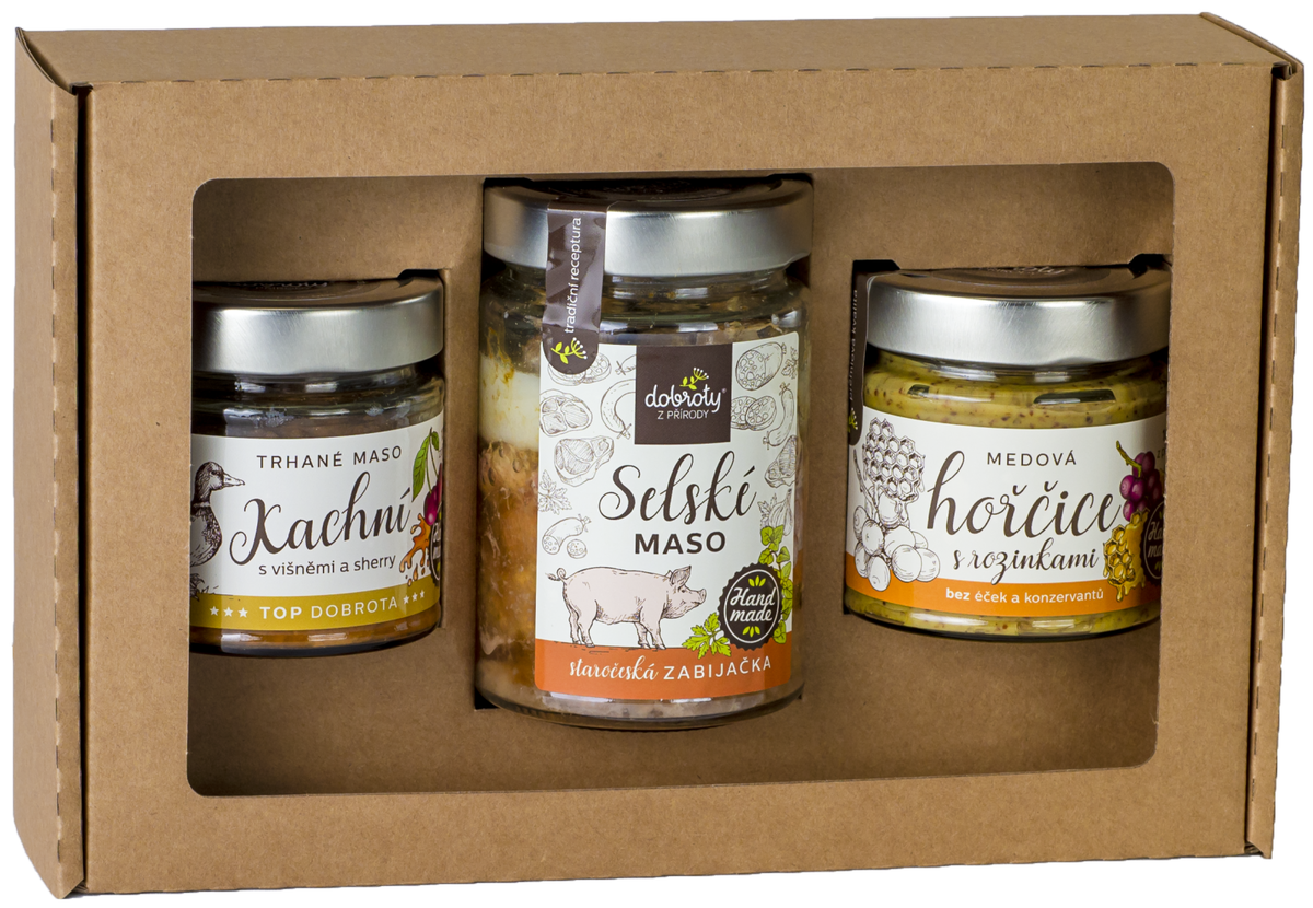 Selské vepřové maso 250g, Hořčice medová s rozinkami 200g, Trhané kachní maso s višněmi a Sherry 140g