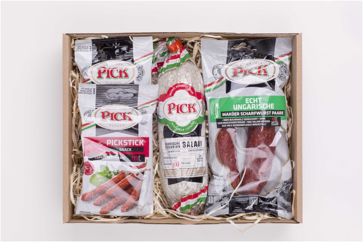 Uherský salám Pick 400 g, maďarská klobása Makói 200 g pálivá, Pick Stick lahůdkové 60 g, Pick Stick pálivé 60 g, trvalivost: 40 dní