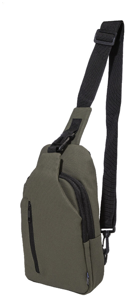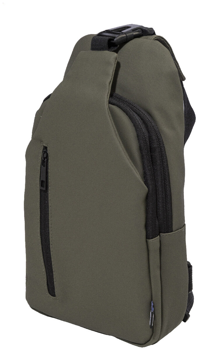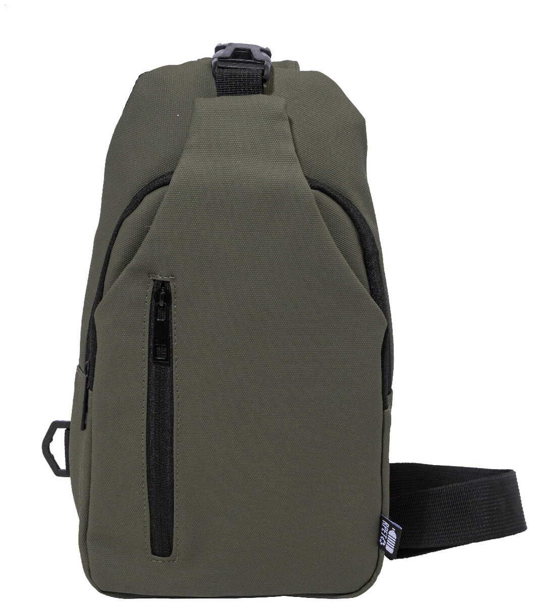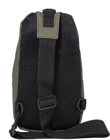 Voděodolná RPET crossbody taška na zavěšení přes rameno s kapsami na zip, zapínáním na přezku a polstrovanými zády. S nastavitelným ramenním popruhem vybaveným polohami na levé a pravé straně. Polyester RPET 600D potažený PU, s výraznou etiketou RPET.
