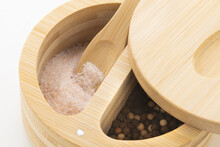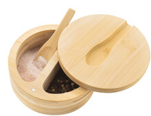 Bambusová slánka a pepřenka se dvěma přihrádkami a magnetickým otočným víkem. Včetně vestavěné servírovací lžíce.
