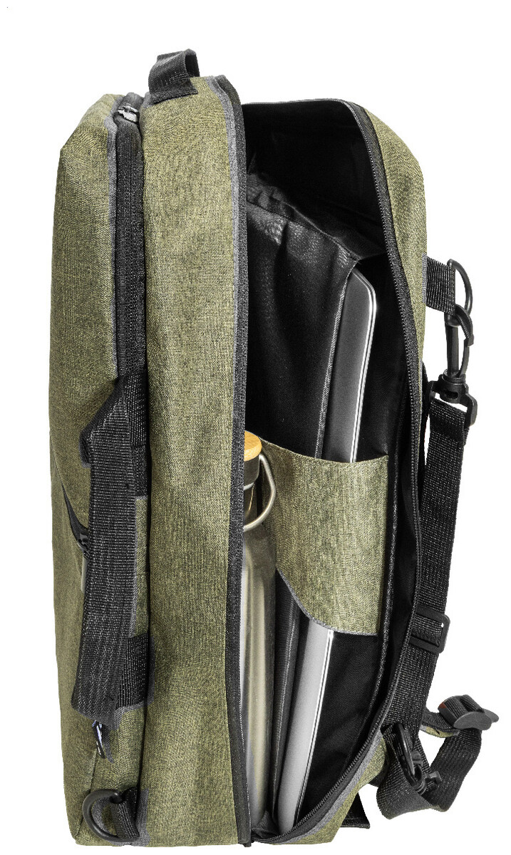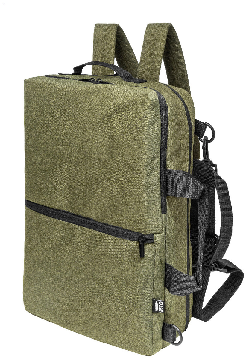 Dvojfunkční RPET batoh a taška na dokumenty s přihrádkou na zip, 2 předními kapsami na zip a polstrovanou přihrádkou na notebook (15"). S polstrovanými zády a ramenními popruhy. Součástí je i odnímatelný ramenní popruh pro použití jako taška na dokumenty. 600D RPET polyester s výrazným štítkem RPET.