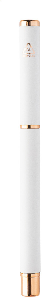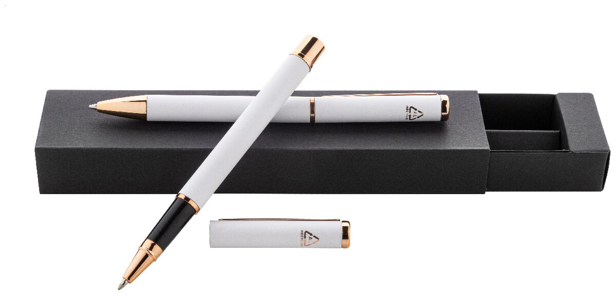Sada per z recyklovaného hliníku s kuličkovým perem a rollerem s pogumovaným povrchem a detaily růžového zlata. S modrou náplní. Se speciálním povrchem pro zrcadlové laserové gravírování v růžovo-zlaté barvě. V černé papírové dárkové krabičce.