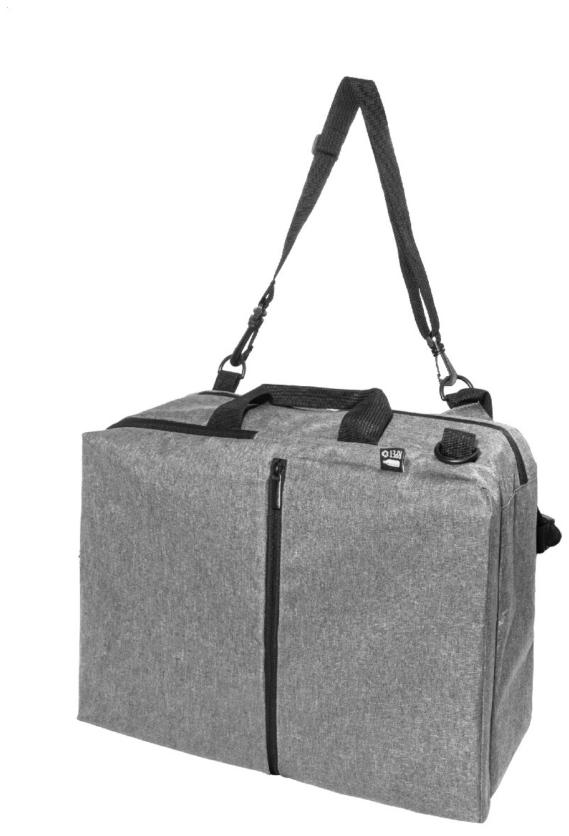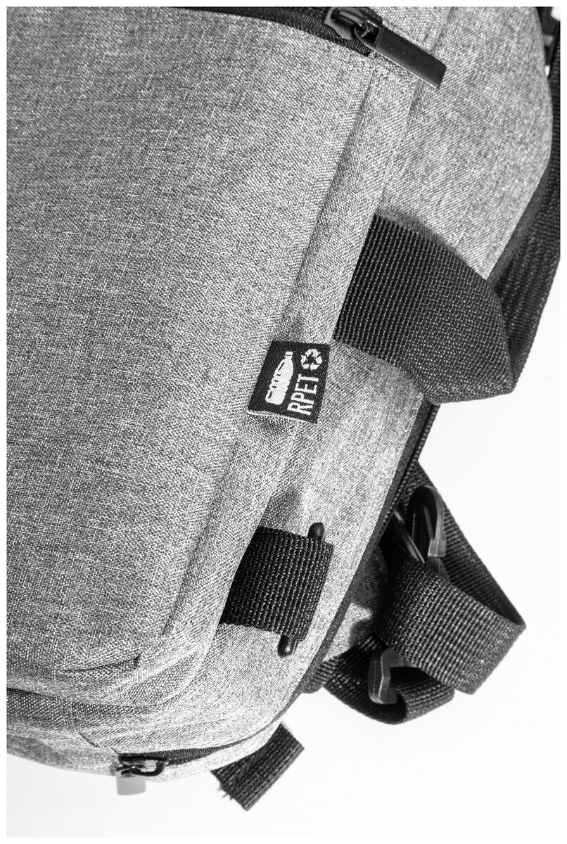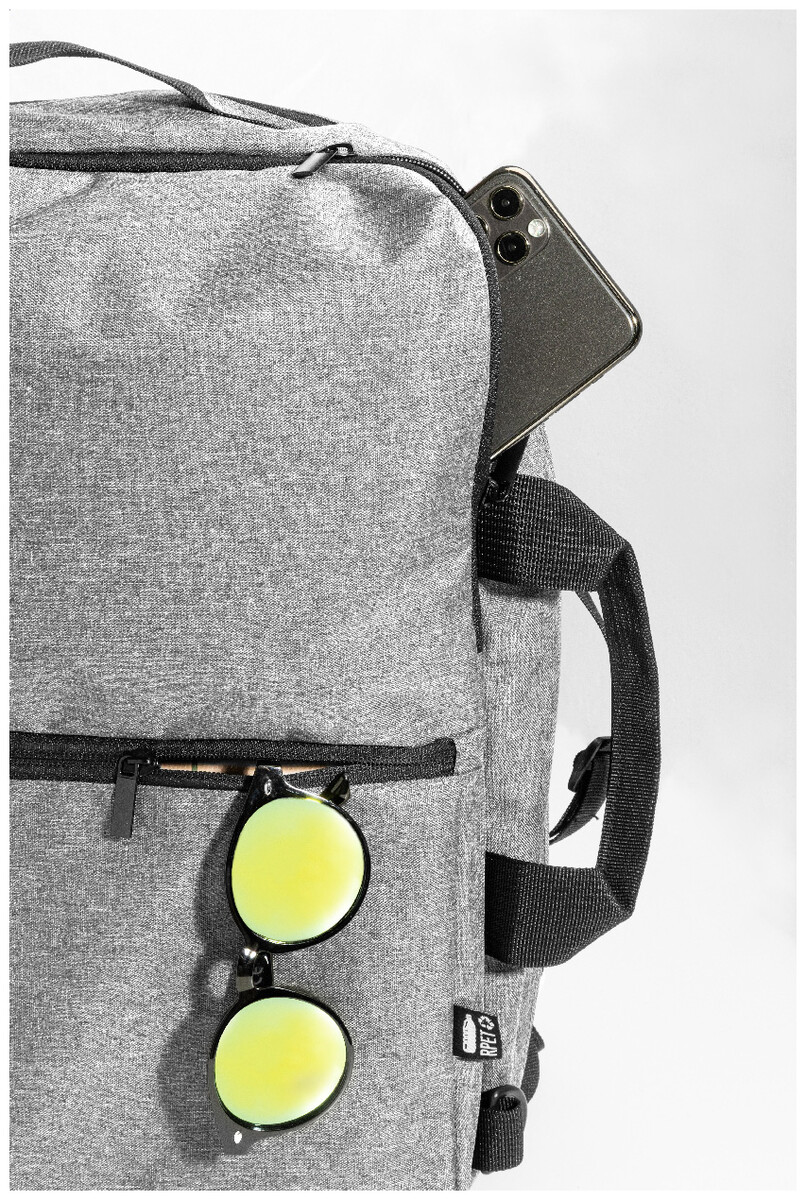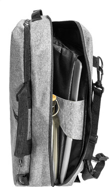 Dvojfunkční RPET batoh a taška na dokumenty s přihrádkou na zip, 2 předními kapsami na zip a polstrovanou přihrádkou na notebook (15"). S polstrovanými zády a ramenními popruhy. Součástí je i odnímatelný ramenní popruh pro použití jako taška na dokumenty. 600D RPET polyester s výrazným štítkem RPET.