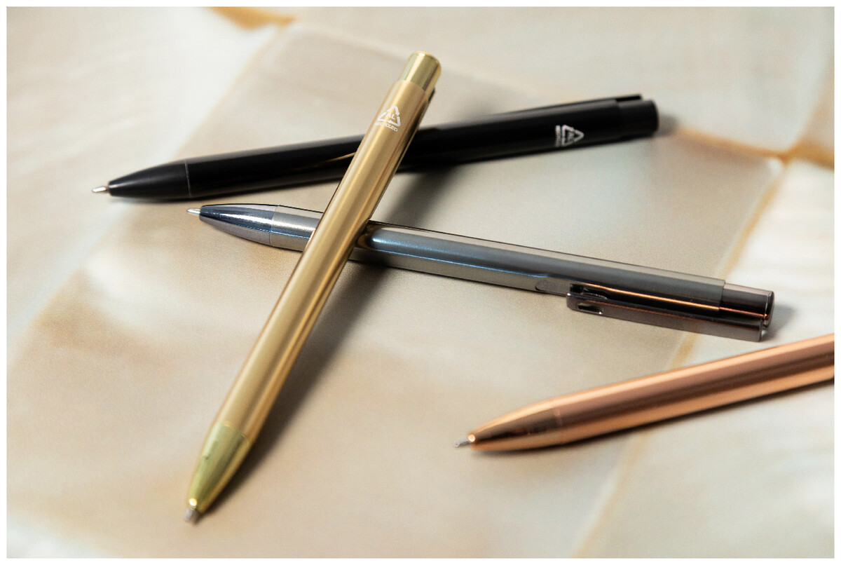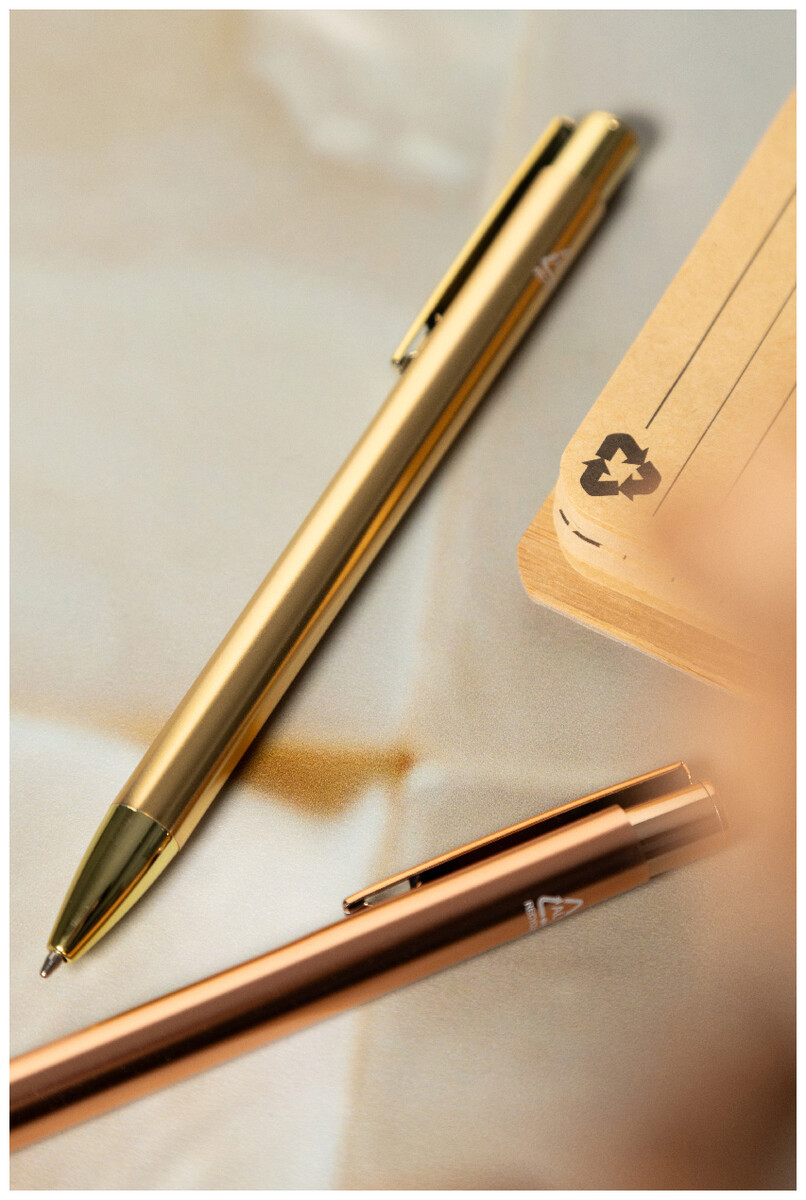Kuličkové pero z recyklovaného hliníku s lesklým kovovým povrchem. S modrou náplní.