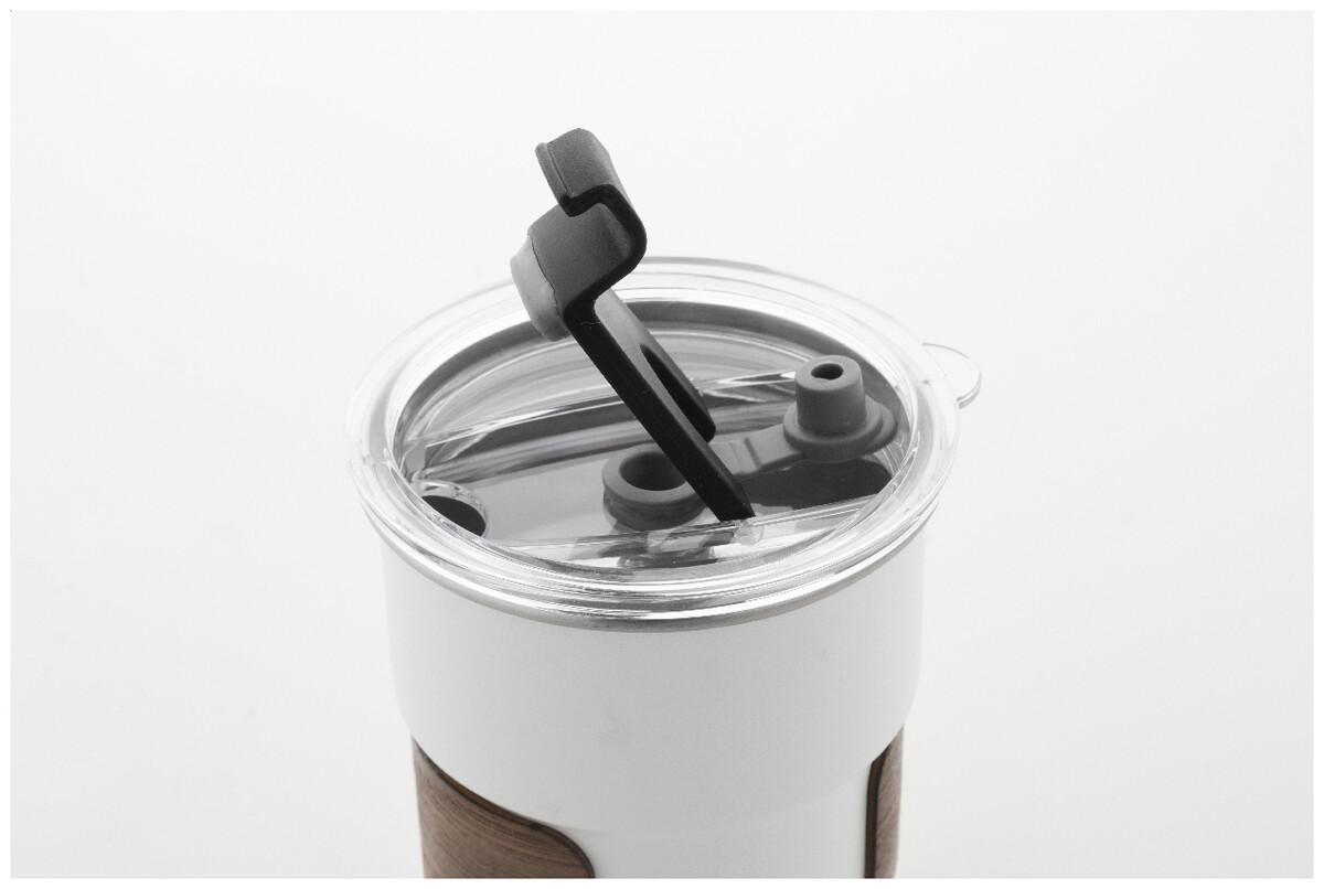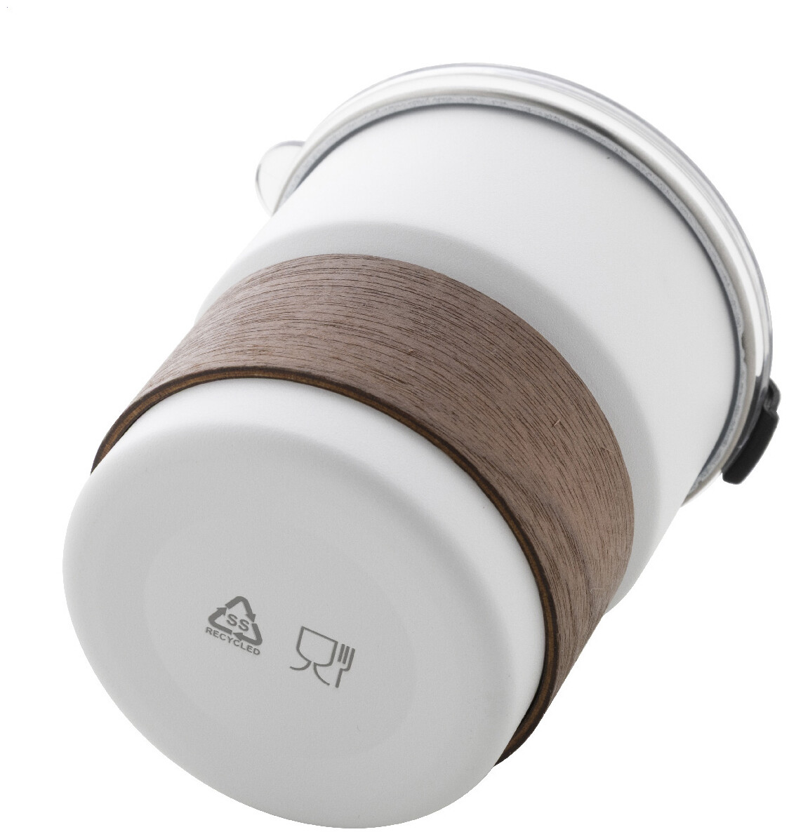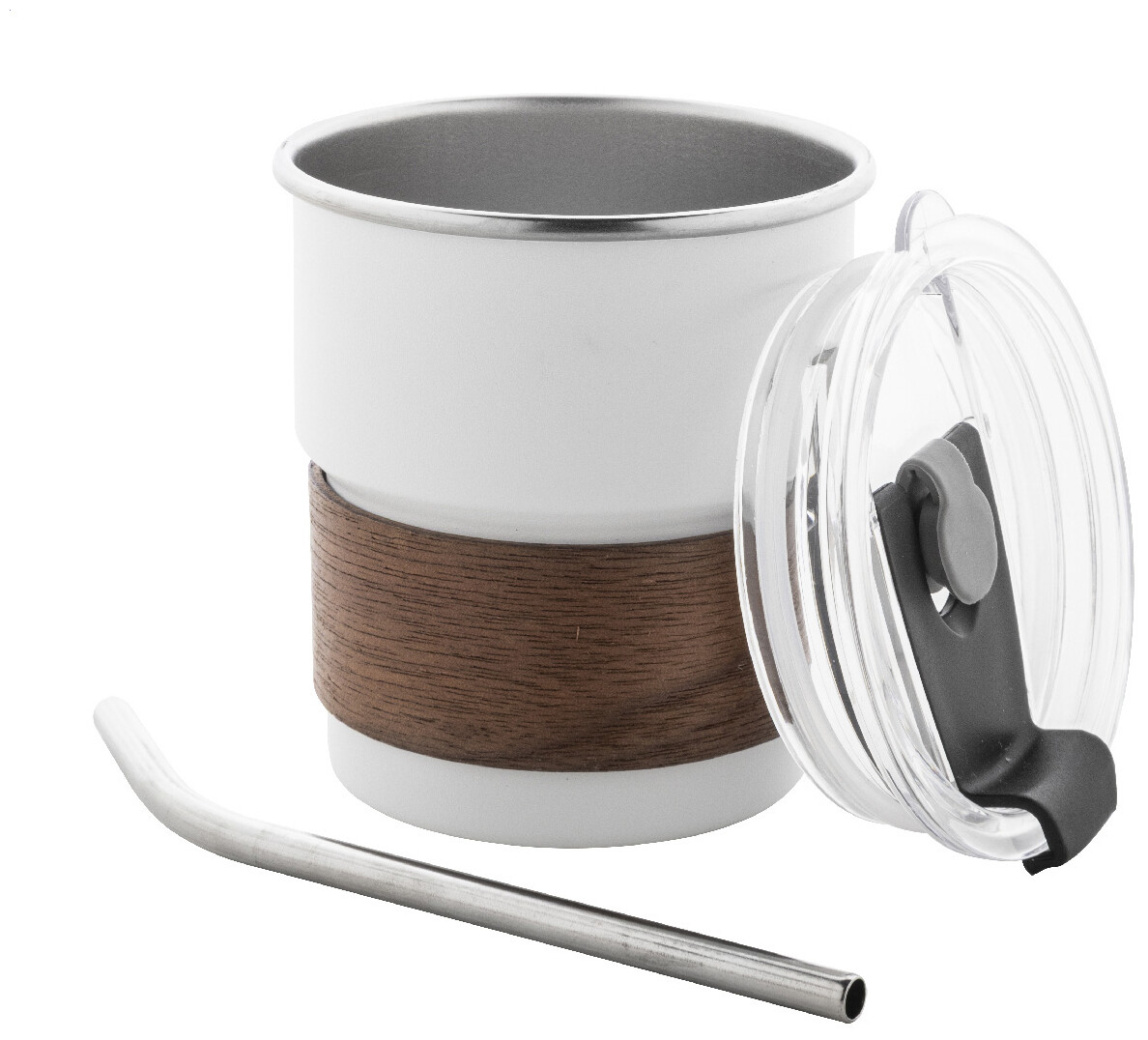 Jednostěnný cestovní hrnek z recyklované nerezové oceli s úchopem z ořechového dřeva, plastovým víčkem a brčkem z recyklované nerezové oceli. 260 ml.
