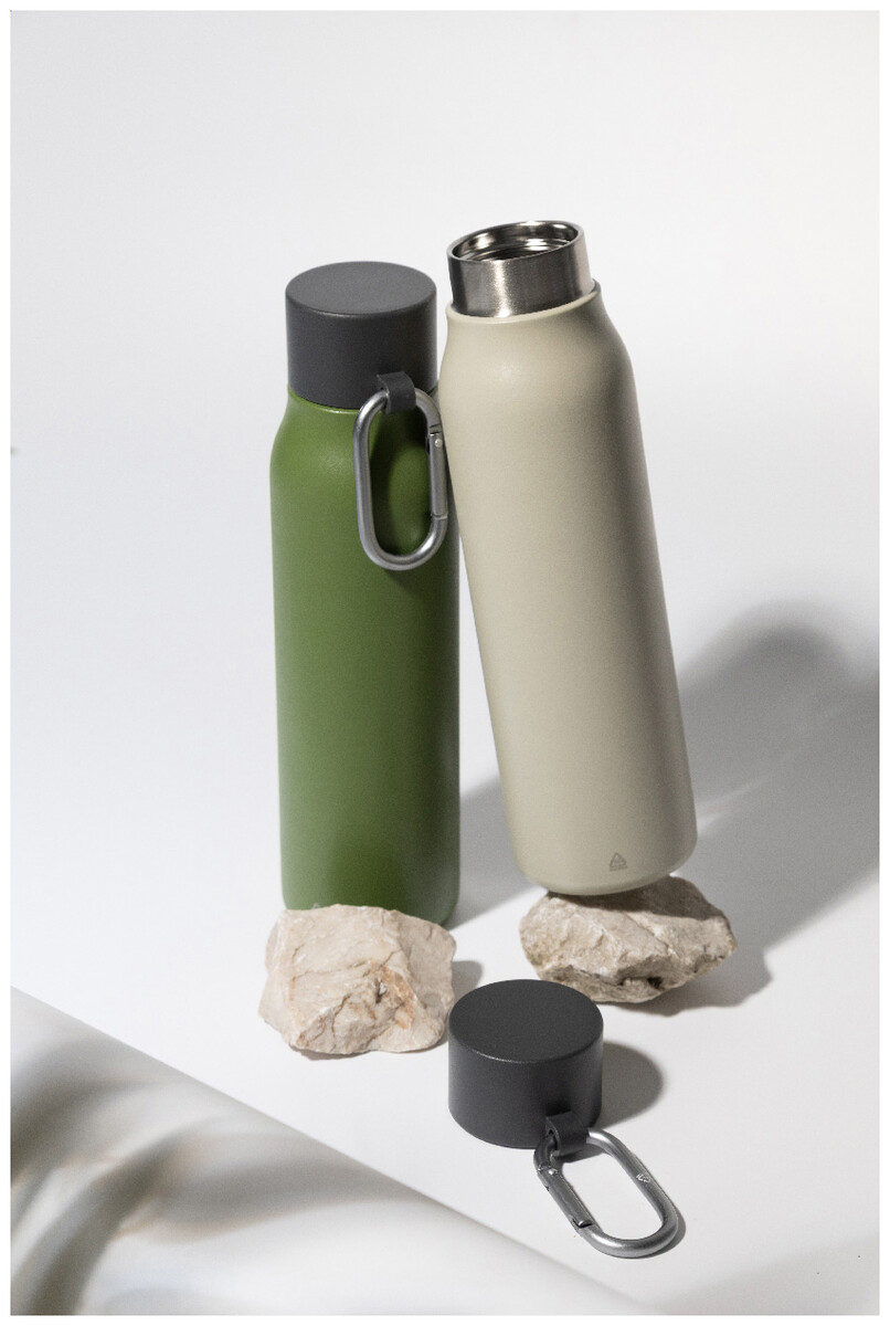 Dvoustěnná vakuová láhev z recyklované nerezové oceli s víčkem z PP a karabinou z recyklovaného hliníku. 500 ml.