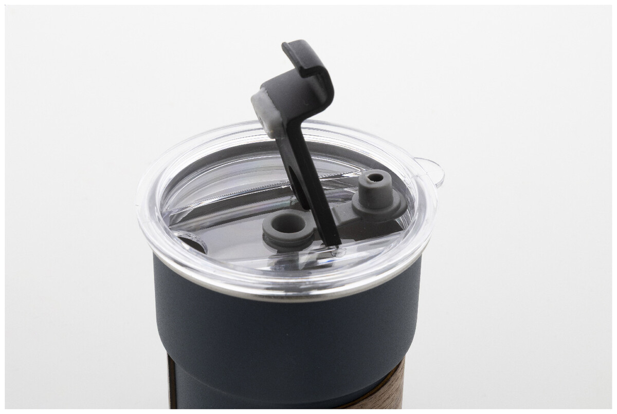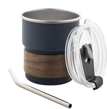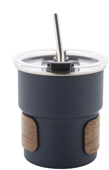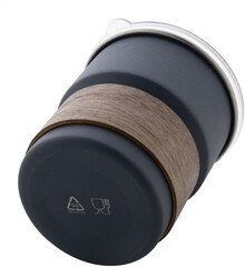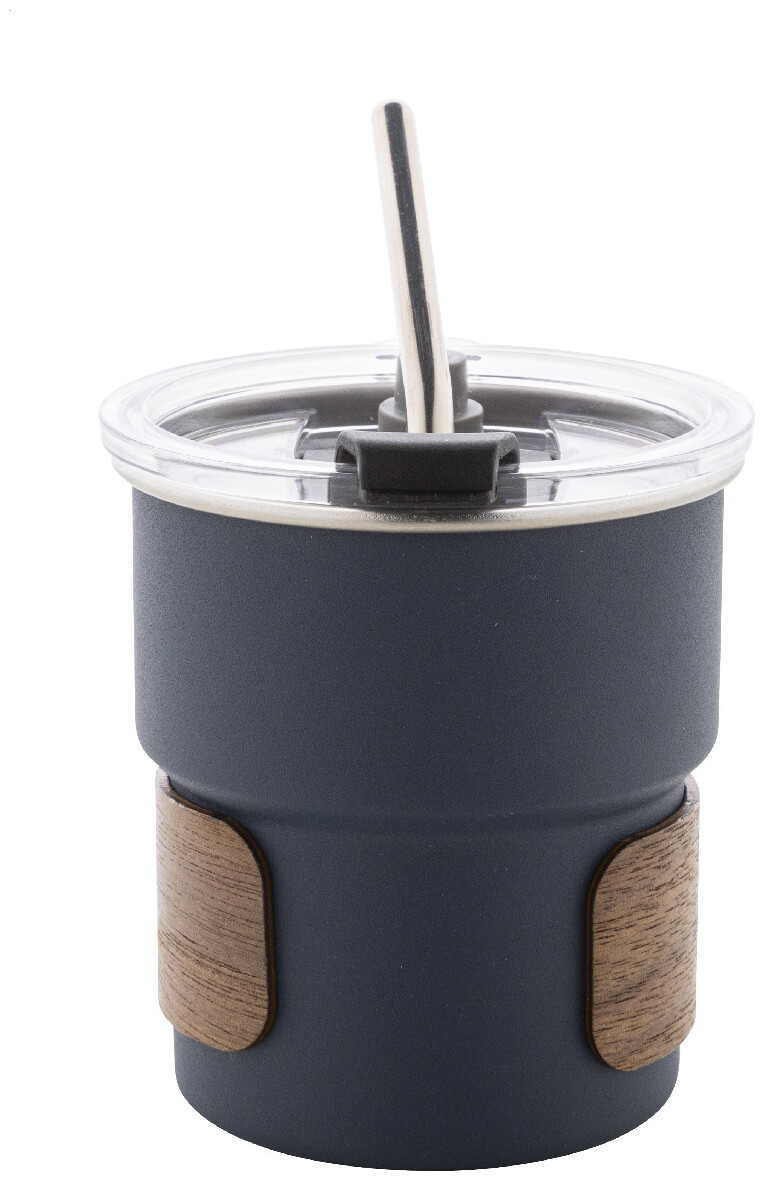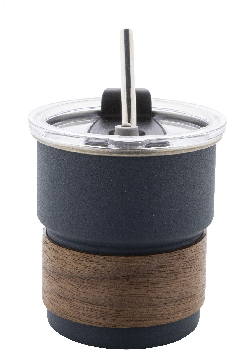 Jednostěnný cestovní hrnek z recyklované nerezové oceli s úchopem z ořechového dřeva, plastovým víčkem a brčkem z recyklované nerezové oceli. 260 ml.