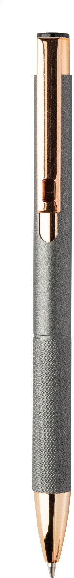 Kuličkové pero z recyklovaného hliníku s matným tělem, texturovaným úchopem a detaily růžového zlata. Se speciálním povrchem pro zrcadlové laserové gravírování v barvě růžového zlata. S modrou náplní.