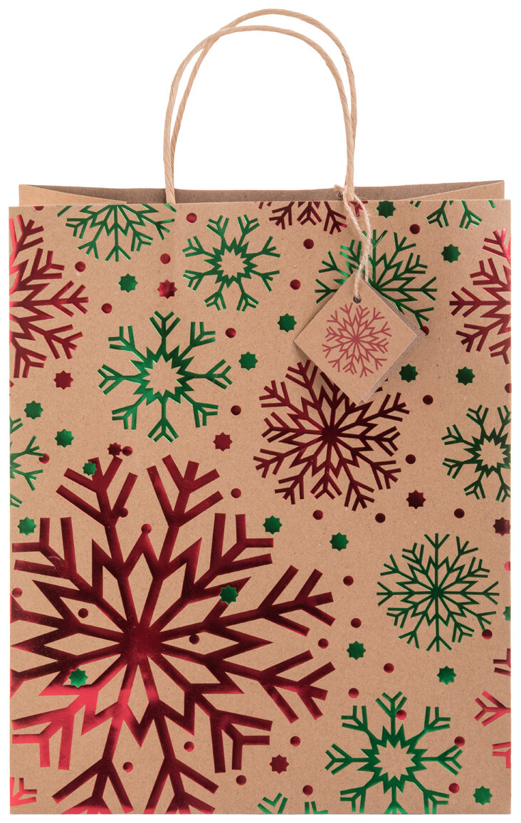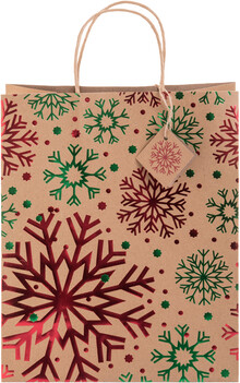 Dárková taška z recyklovaného kraftového papíru s vánočním designem vyraženým fólií, kroucenými uchy a dárkovou visačkou. 140 g/m2.