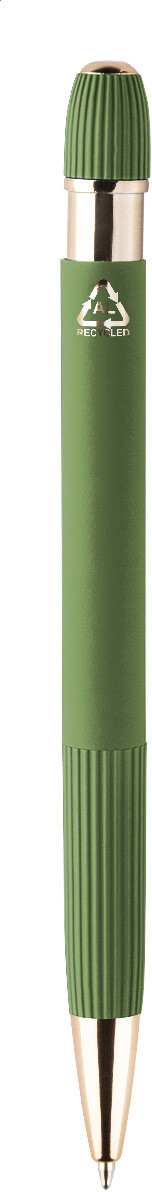 Kuličkové pero z recyklovaného hliníku s pogumovaným tělem a detaily v růžovo-zlaté barvě. Se speciálním povlakem pro zrcadlové laserové gravírování v růžovo-zlaté barvě. S modrou náplní.