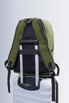 Recyklovaný plátěný batoh s hlavní přihrádkou na zip, polstrovanou přihrádkou na notebook (15"), 2 předními kapsami na zip, bočními kapsami, popruhem na kolečkách, polstrovanými zády a ramenními popruhy. 70% recyklované bavlny a 30% RPET polyesteru. S výrazným štítkem recyklované bavlny.
