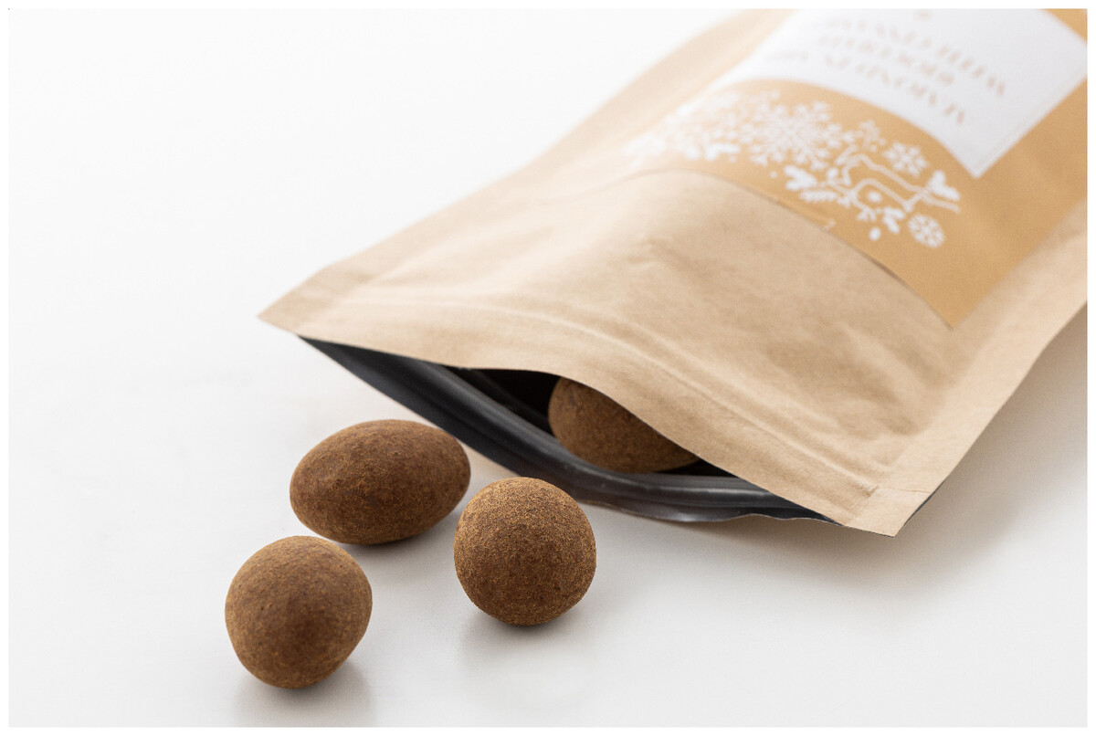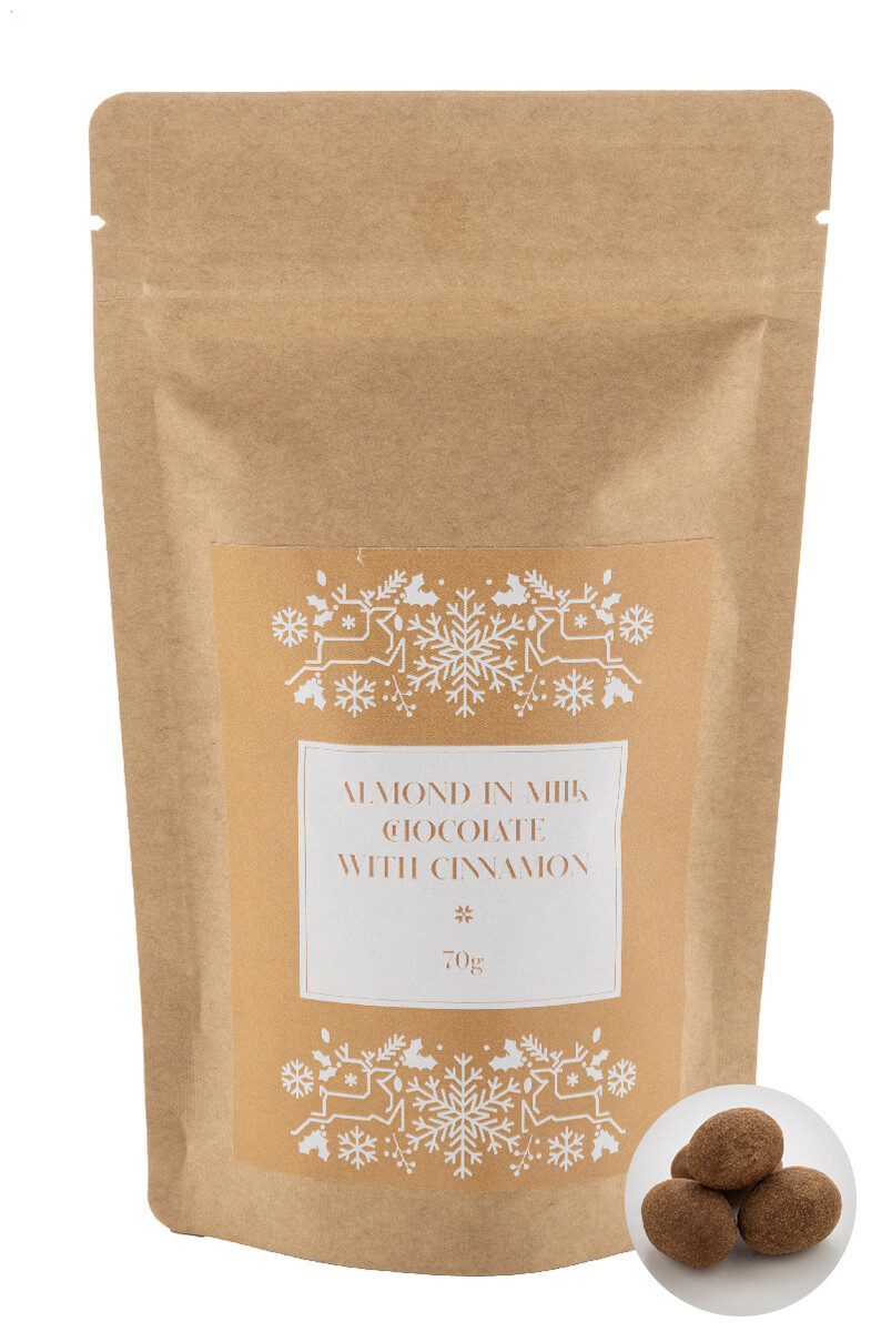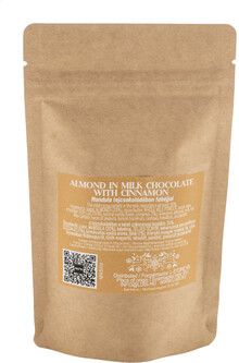 Mandle obalené mléčnou čokoládou a skořicí v přírodním kraftovém papírovém sáčku. 70 gramů.