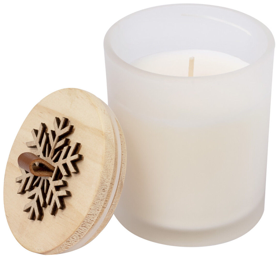 Vosková svíčka s vůní vanilky ve skleněném svícnu s dřevěným víčkem s ozdobou sněhových vloček.
