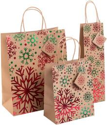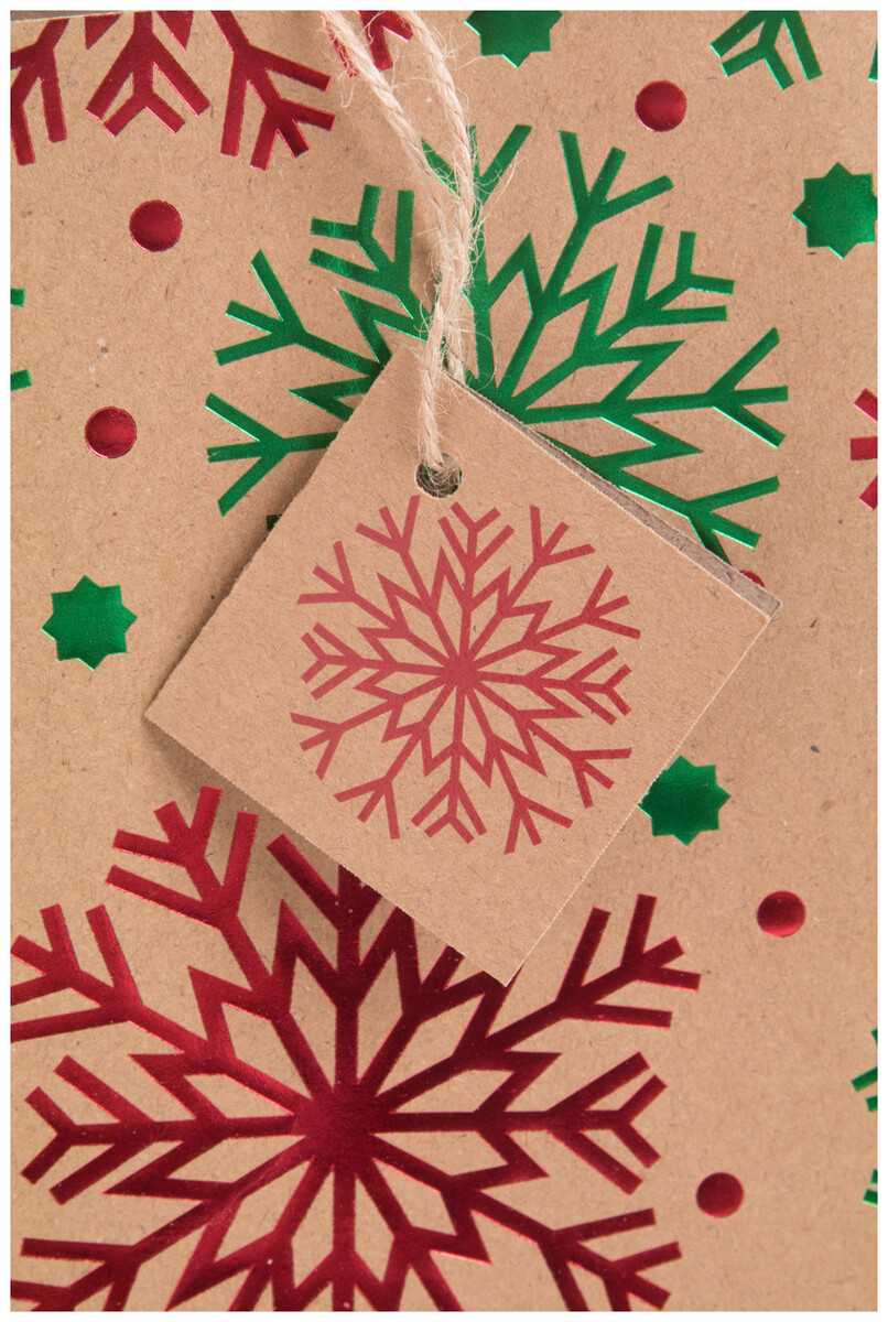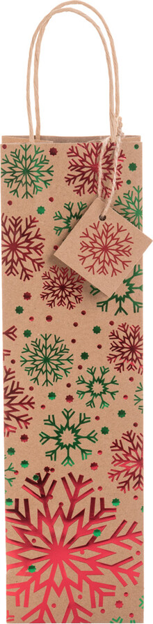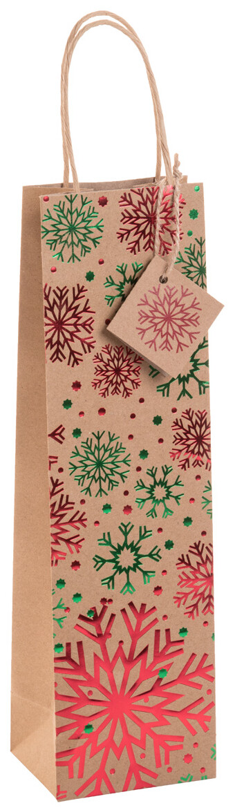 Dárková taška z recyklovaného kraftového papíru s vánočním designem vyraženým fólií, kroucenými uchy a dárkovou visačkou. 140 g/m2.