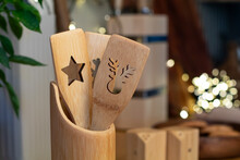 Vařečka z bambusu s vyřezaným vánočním stromečkem.