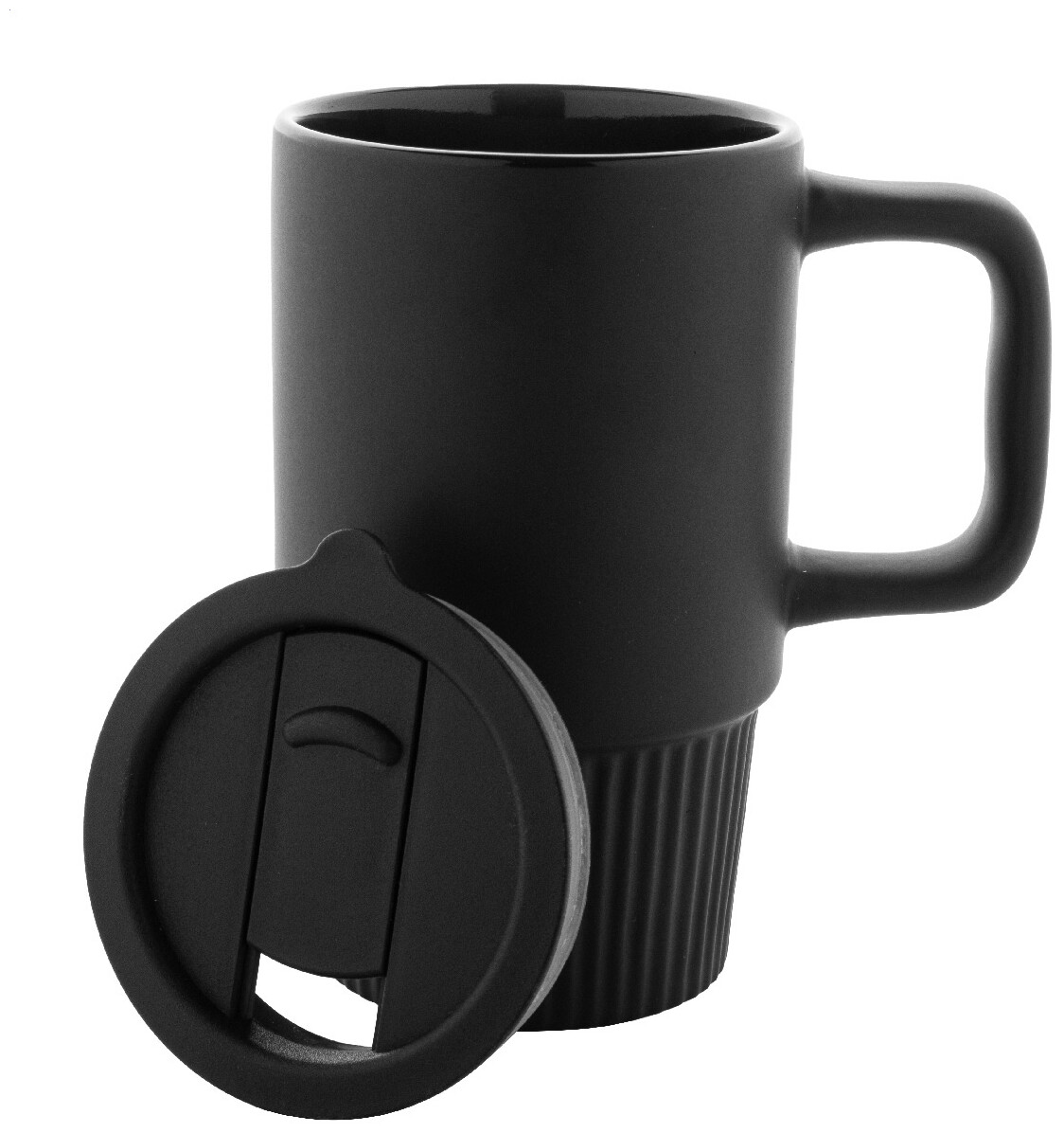 Vysoce kvalitní keramický cestovní hrnek s matným vnějším povrchem a plastovým víčkem z polypropylenu. 420 ml.
