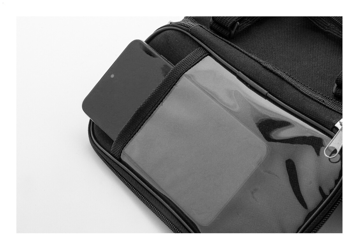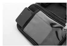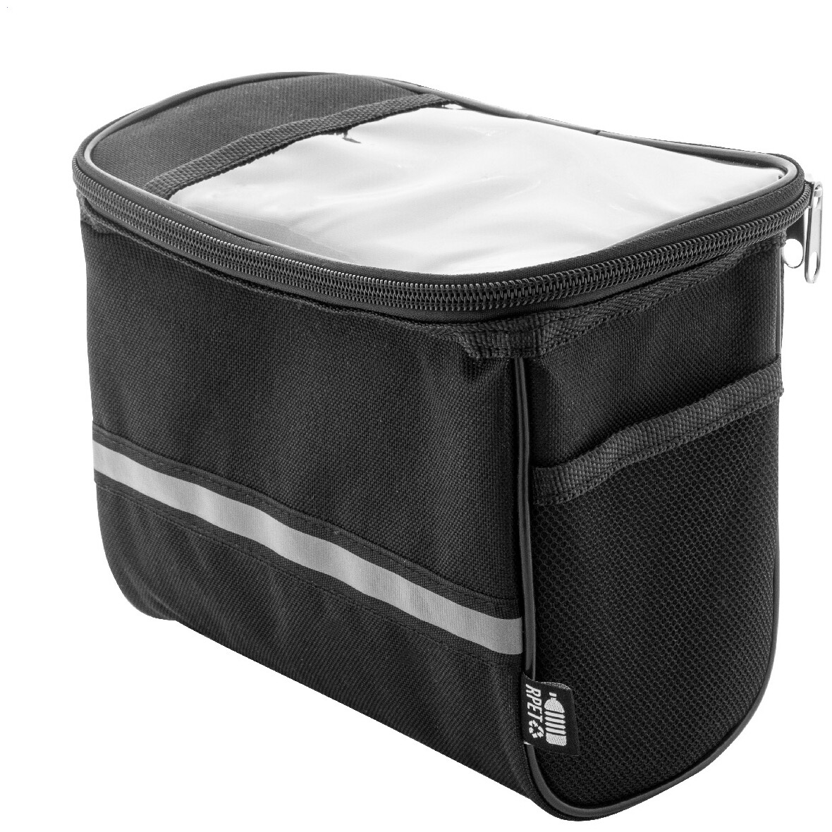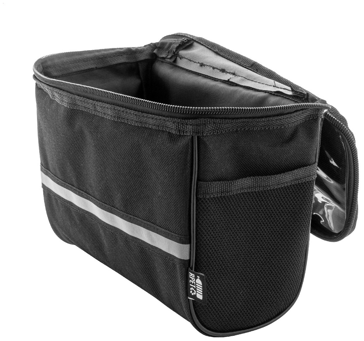 Brašna na řídítka kola z RPET s přihrádkou na zip, kapsou na mobil s dotykovou obrazovkou, bočními síťovanými kapsami, nastavitelnými popruhy na suchý zip a reflexním proužkem. Polyester 600D RPET s výrazným štítkem RPET.