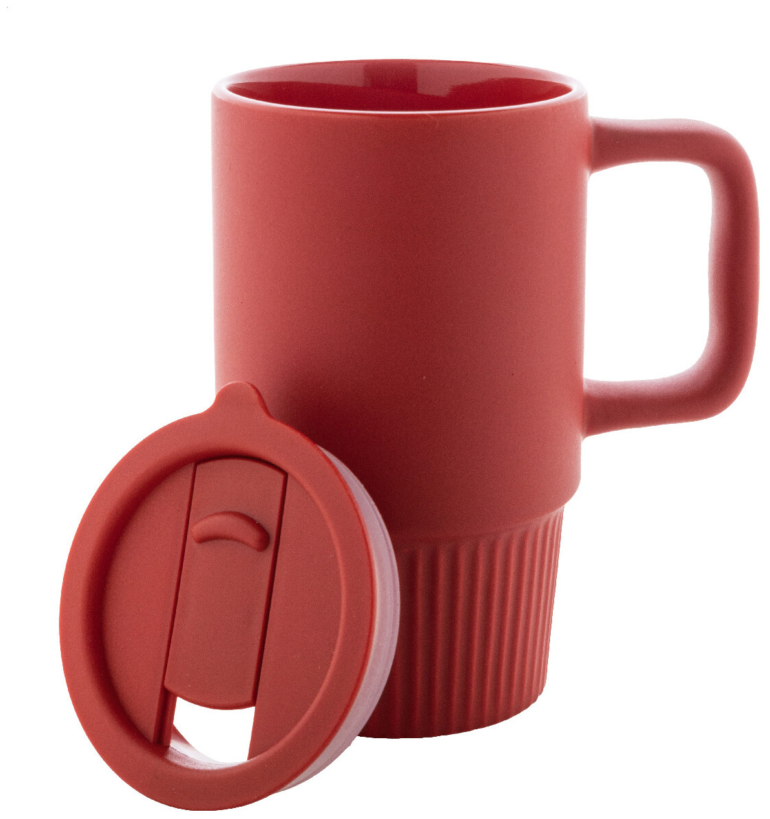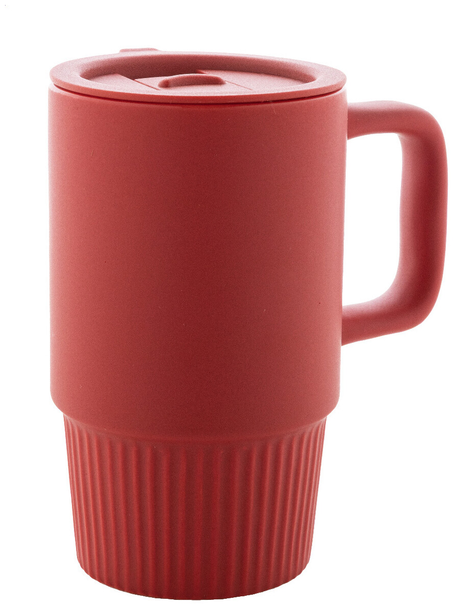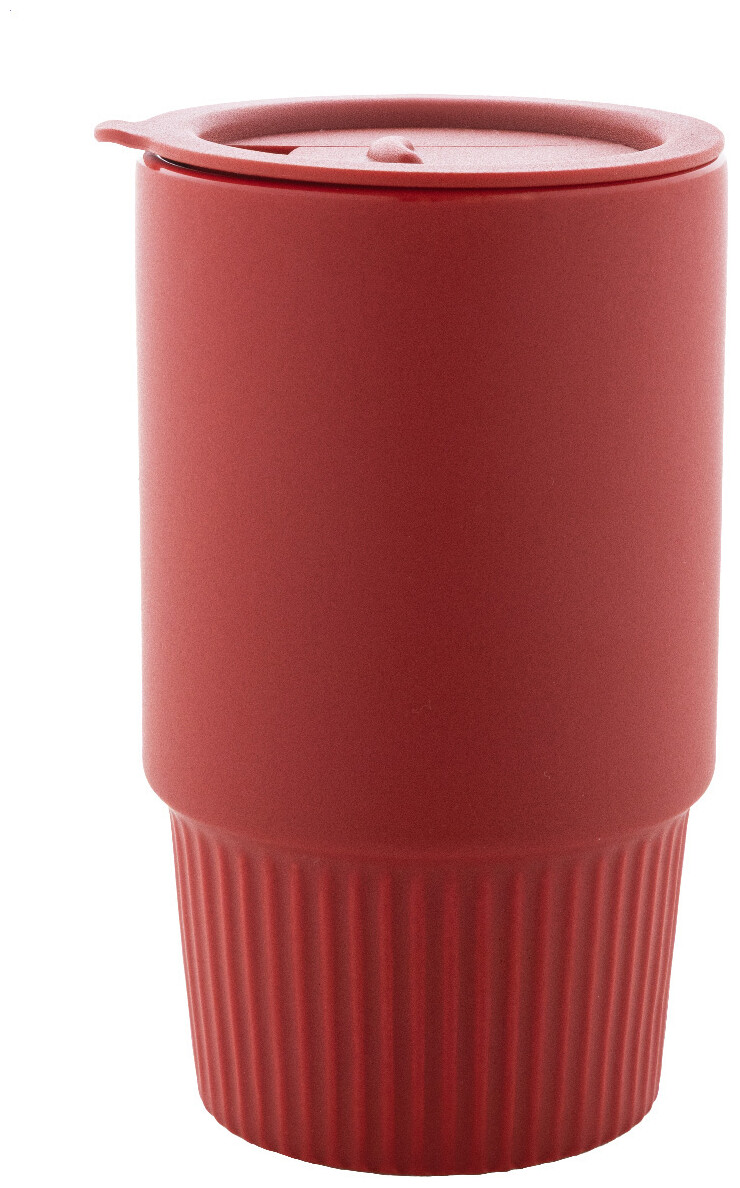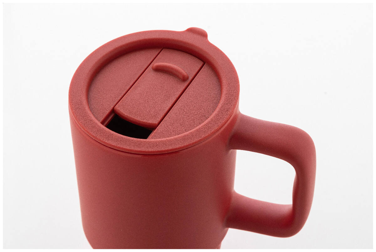 Vysoce kvalitní keramický cestovní hrnek s matným vnějším povrchem a plastovým víčkem z polypropylenu. 420 ml.