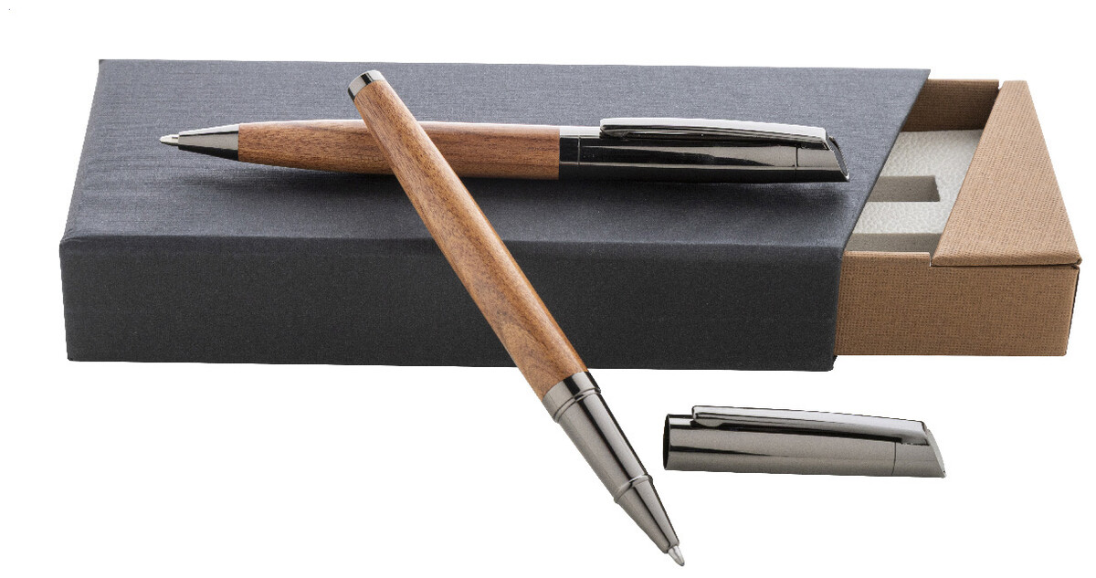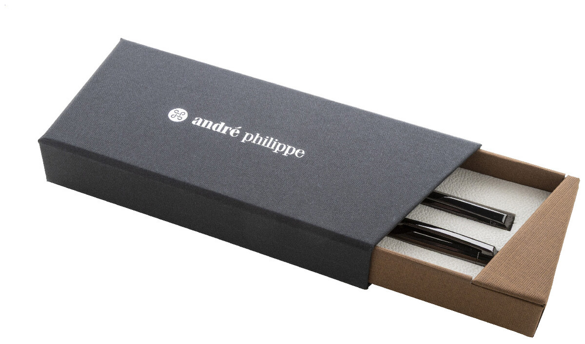 Elegantní sada kovového kuličkového pera a rolleru s dřevěným tělem a lesklými detaily v barvě antracit. Ve dvoubarevné dárkové krabičce s modrou náplní. Produkt značky André Philippe.