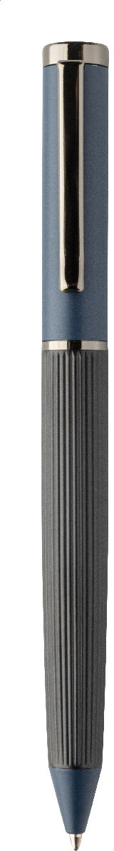 Elegantní sada kovového kuličkového pera a rolleru s pruhovaným tělem, barevnými akcenty a lesklými detaily v barvě antracit. V barevně sladěné dárkové krabičce a s modrou náplní. Produkt značky André Philippe.