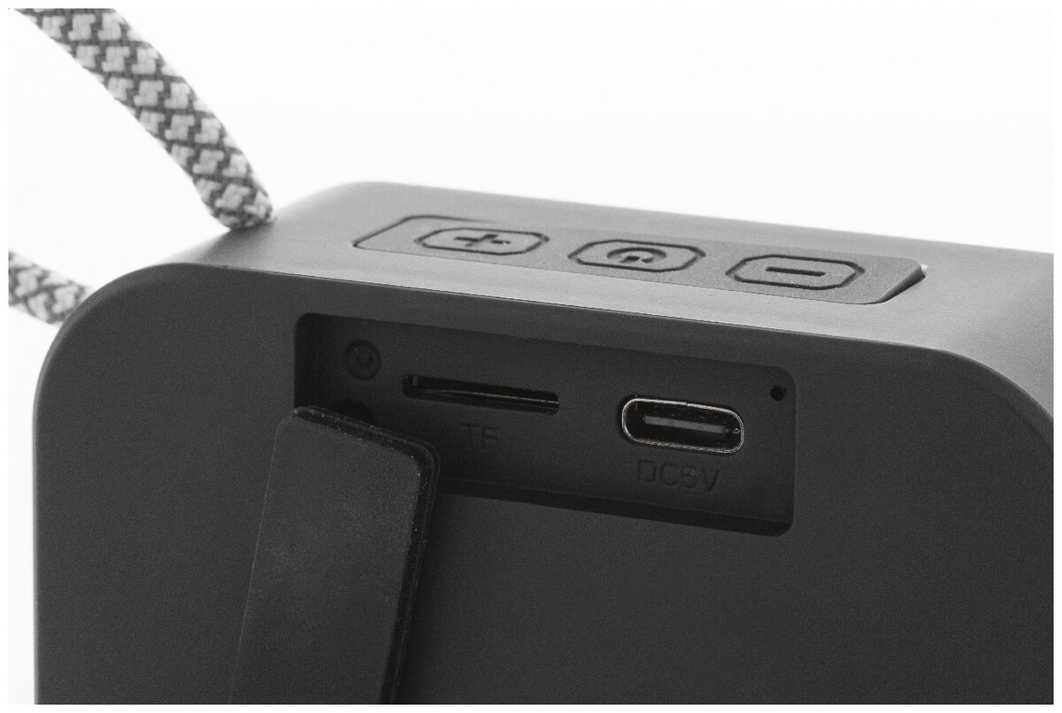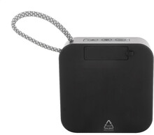 Bezdrátový reproduktor z recyklovaného ABS s popruhem na nošení, kovovou síťovinou a dobíjecí baterií (300 mAh). S funkcí přehrávání MP3 karet micro SD. Včetně nabíjecího kabelu USB.