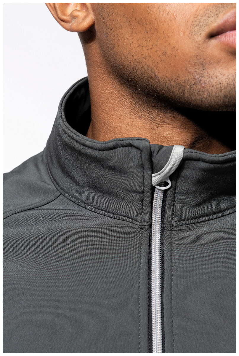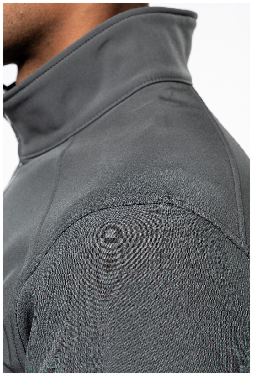 Dvouvrstvá softshellová bunda na zip s bočními kapsami na zip. S kontrastními zipy. Vodoodpudivá tkanina. Vnější strana: 95 % polyester a 5 % elastan. Vnitřní strana: 100% polyester micro polar fleece. Materiál: 300 g/m2. Výrobek značky Kariban.