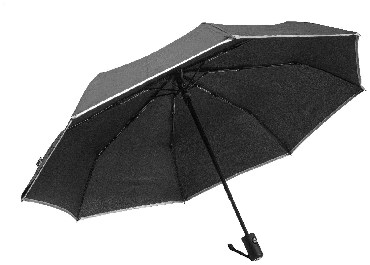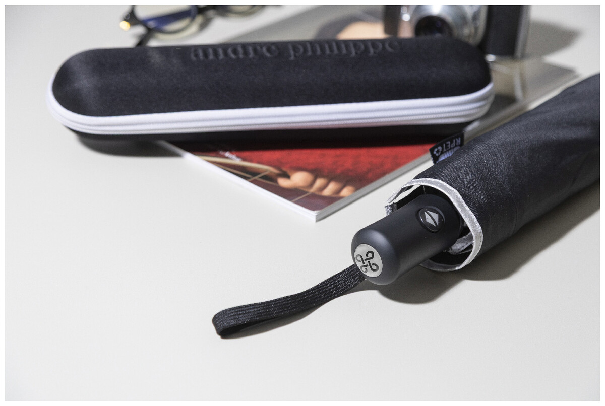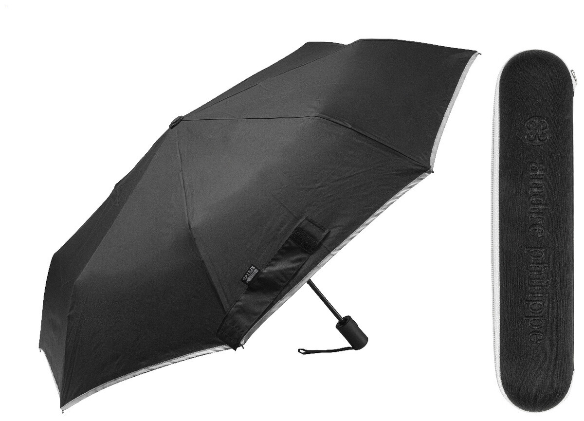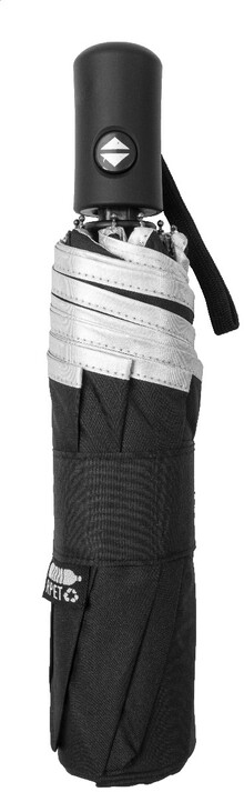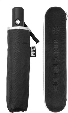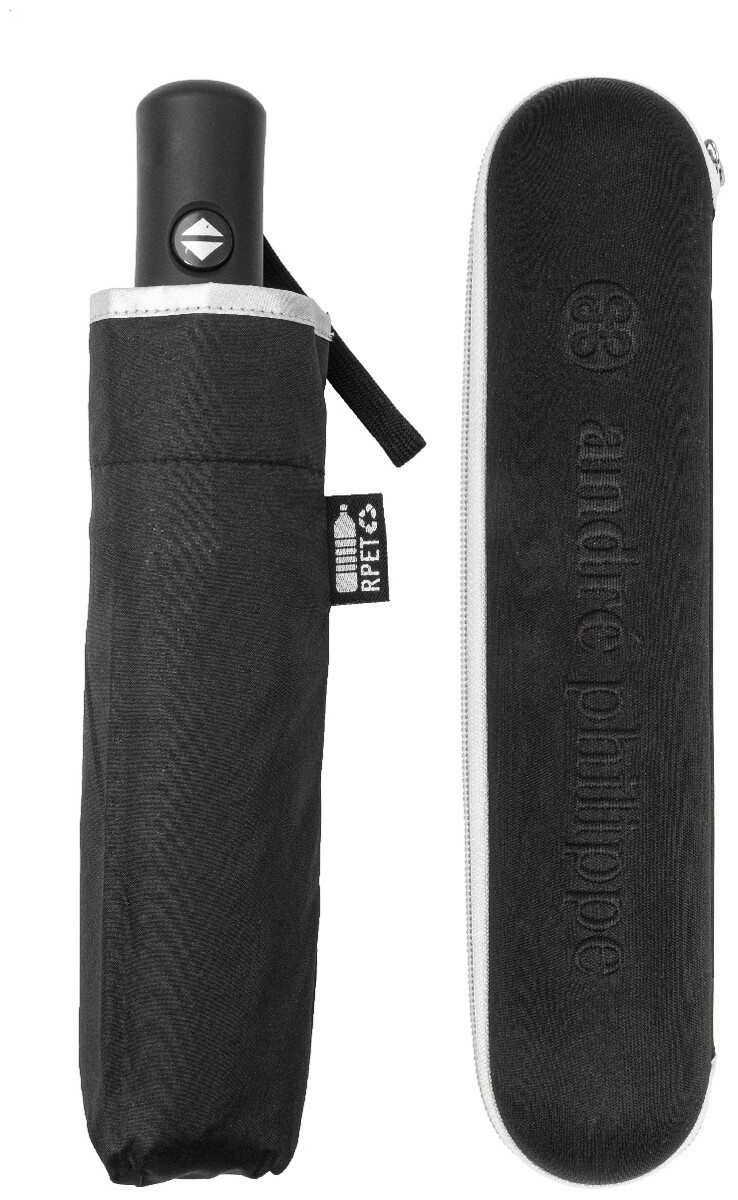 Plně automatický (otevírání/zavírání), větruodolný skládací deštník s 8 panely, stříbrné lemování. S kovovým rámem, žebry ze skelných vláken, pogumovanou rukojetí s popruhem na ruku a přepravním pouzdrem. Ponž 190T RPET. S výrazným štítkem RPET. Ve značkovém pevném pouzdře na zip. Výrobek značky André Philippe.