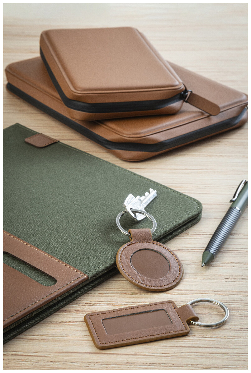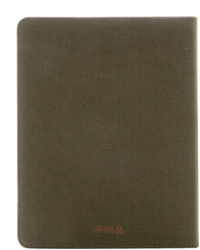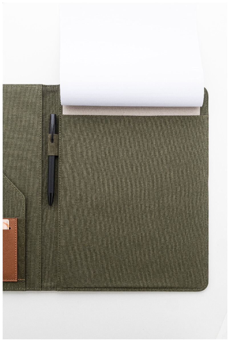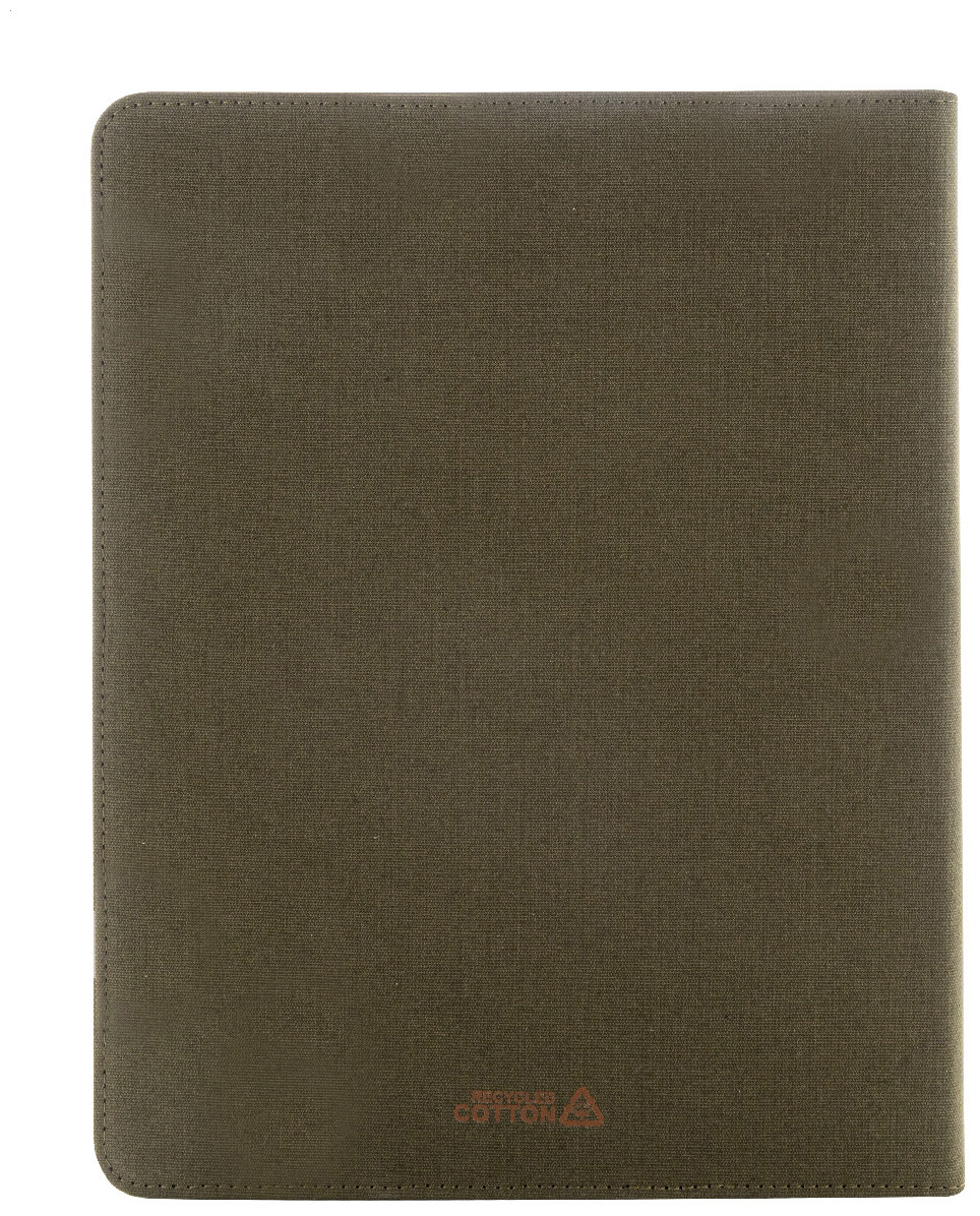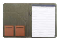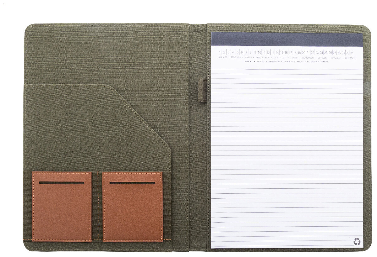 Složka na dokumenty A4 z recyklovaného plátna a recyklované umělé kůže s několika předními a vnitřními kapsami. S blokem na 20 linkovaných listů z recyklovaného papíru. 70 % recyklované bavlny a 30 % RPET polyesteru.