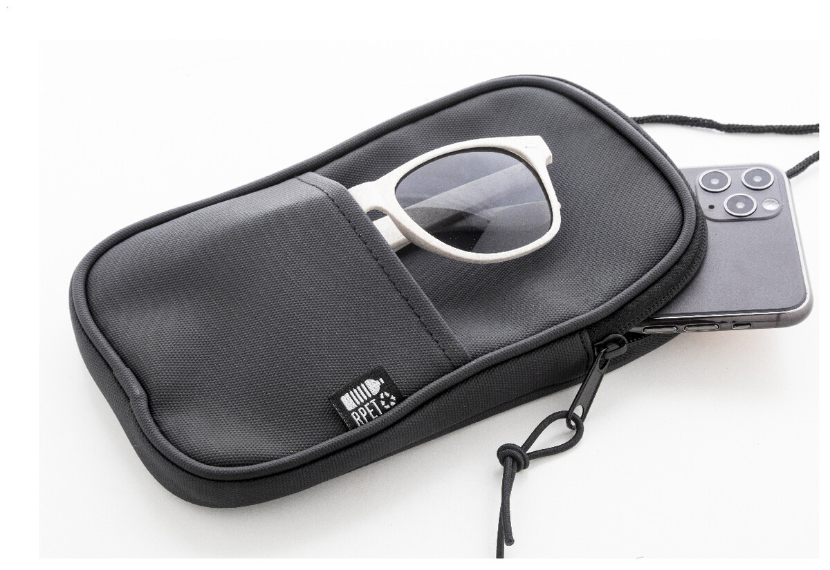 Voděodolná RPET crossbody taška na mobilní telefon s hlavní přihrádkou na zip, přední kapsou a nastavitelnou šňůrkou. Polyester RPET 600D potažený PU, s výrazným štítkem RPET.