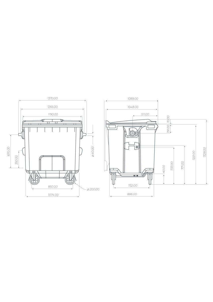 Kontejner má 4 kolečka, která jsou navržená tak, aby na nich neulpívaly nečistoty a usnadnilo se jejich čištění. Kolečka jsou opatřena brzdou.