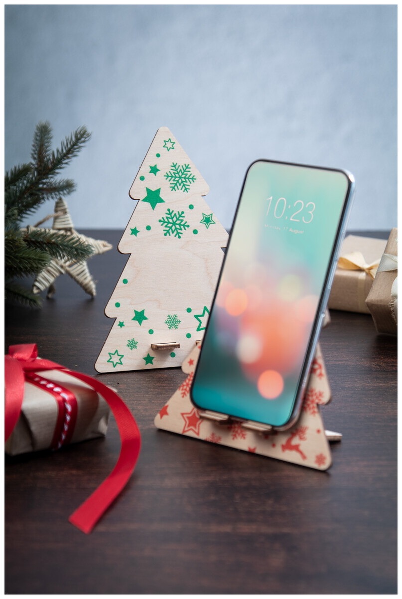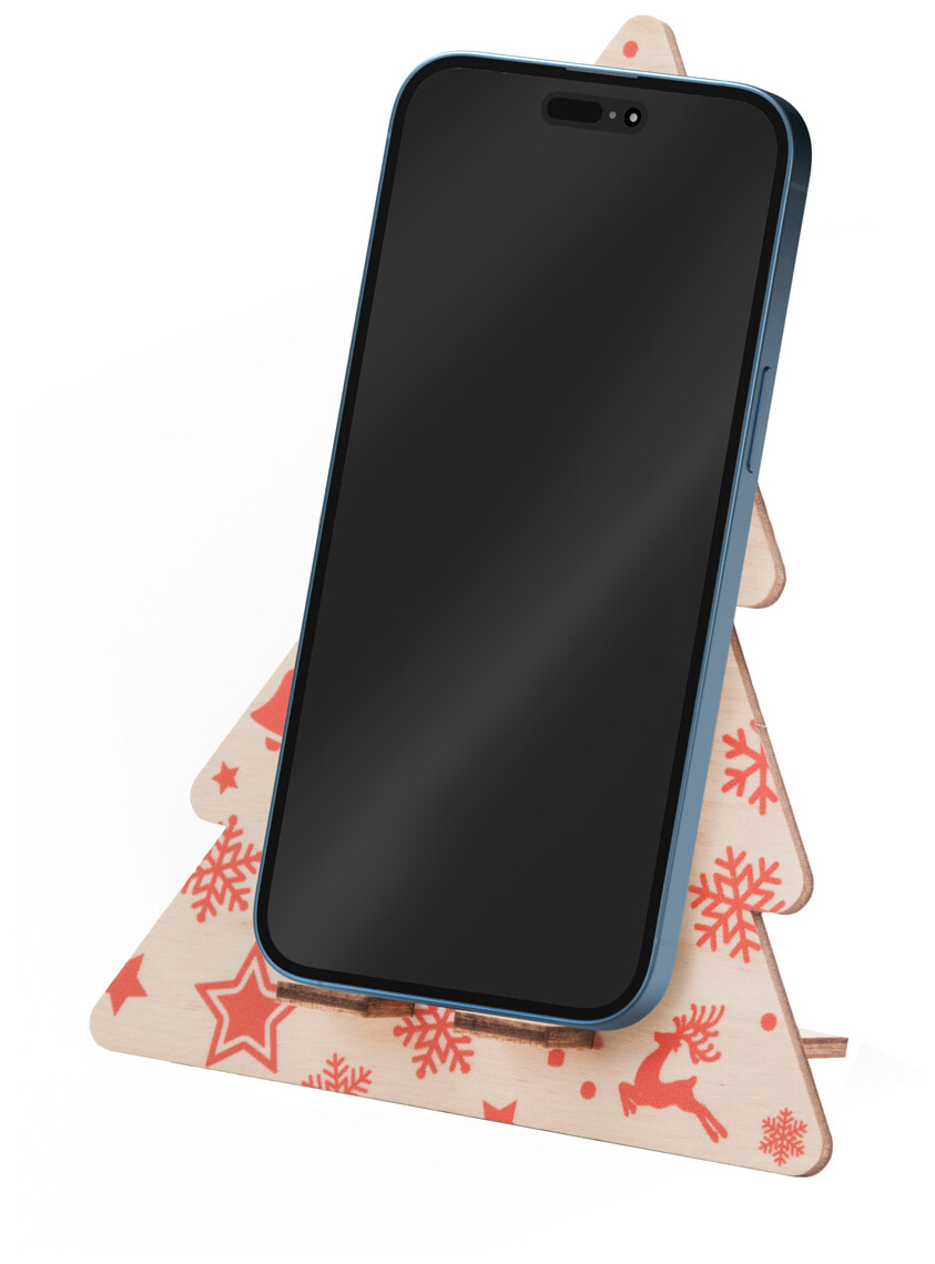 Stojánek na mobil ve tvaru vánočního stromku z březové překližky. Dodáváno rozložené.