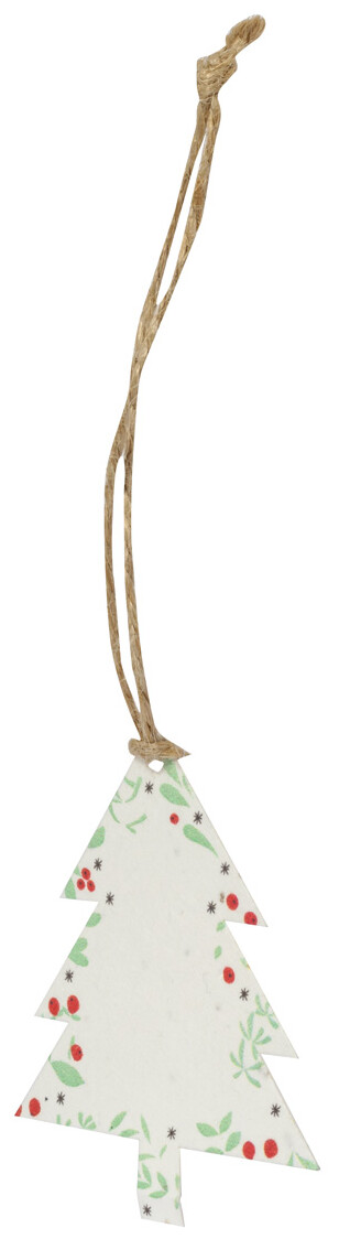 Papírová ozdoba na vánoční stromeček s jutovým provázkem. Obal semenného papíru obsahuje semena petúnie v různých barvách, která lze zasadit oddělením z provázku.